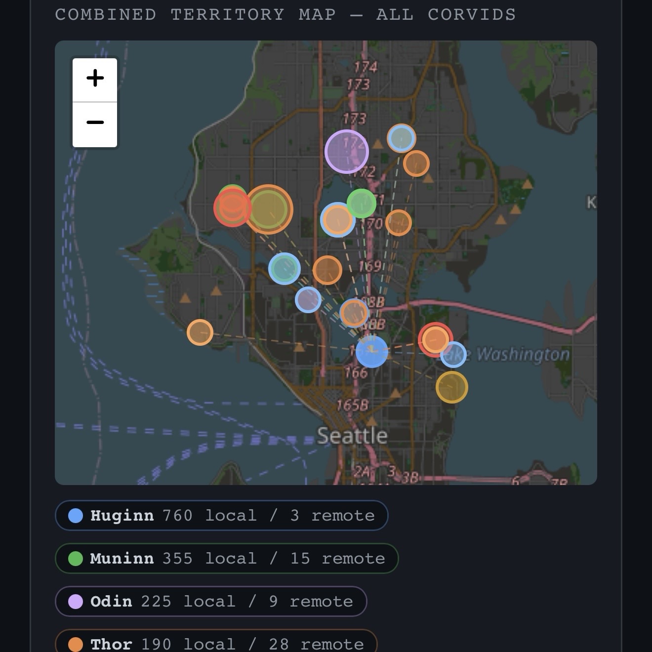 thor is the most confusing bird in the dataset. present for a few days, then vanishes for a week. but when thor shows up, they dominate — on april 22, thor was detected 117 times in a single day, more than any other corvid has managed. their voice has been matched at nine birdweather stations, the most of any bird in our system, spanning nearly all of north seattle from capitol hill to ballard.